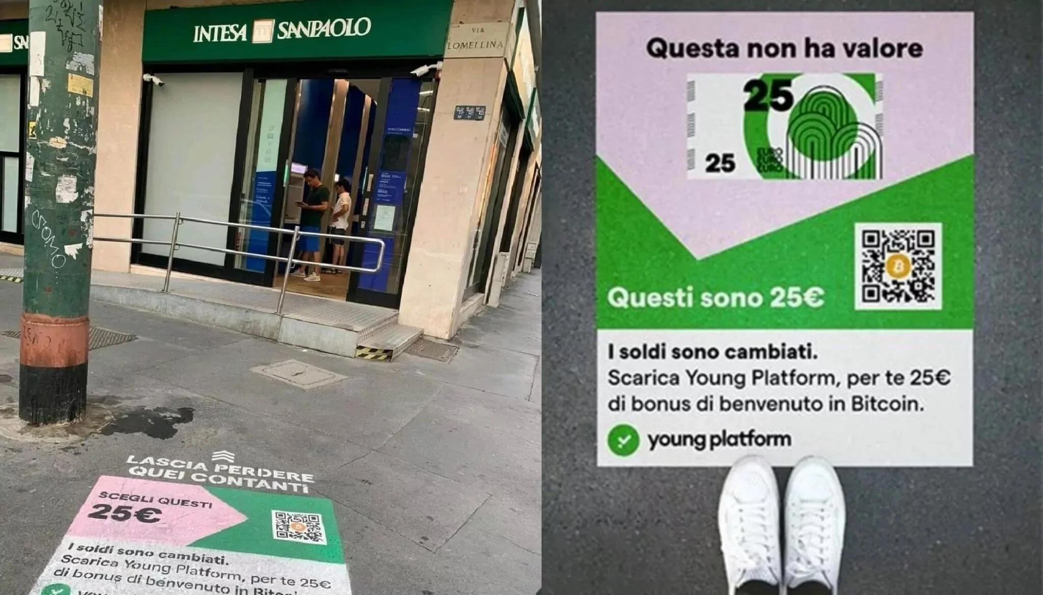 le “inserzioni” sono state posizionate in prossimità delle banche, trasmettendo un messaggio di rottura con la finanza tradizionale.